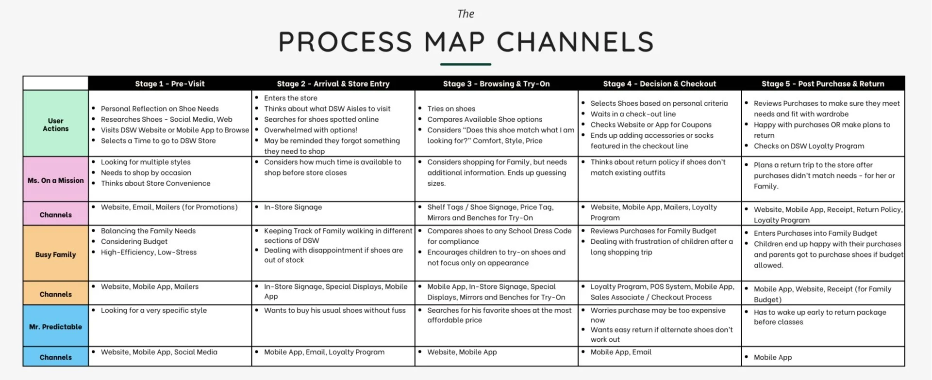 To better understand the shopping experiences of our three personas, we created detailed journey maps for Ms. On a Mission, the Busy Family, and Mr. Predictable. Each map outlined user actions, touchpoints, considerations, and interactions with DSW’s marketing materials or platforms, such as the website, app, in-store signage, and promotional emails.