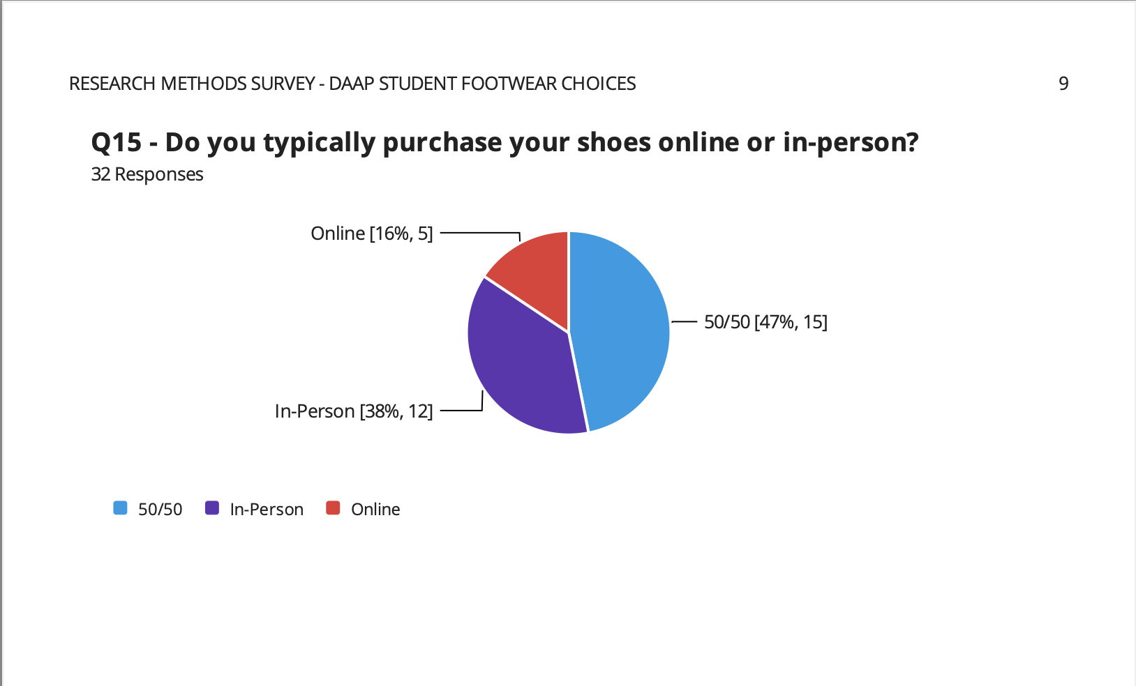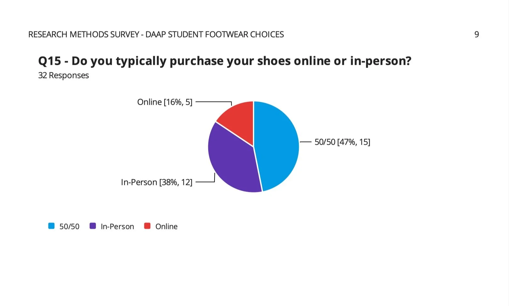 To understand the current landscape of footwear shopping, we conducted research with students at the University of Cincinnati's School of Design, Architecture, Art, and Planning. The team developed a targeted survey to understand shopping behaviors, footwear selection preferences, and decision-making criteria. Out of 32 student participants, 46.9% wanted to use online and in-person experiences to shop for shoes. This highlights critical consumer needs in the footwear shopping experience.