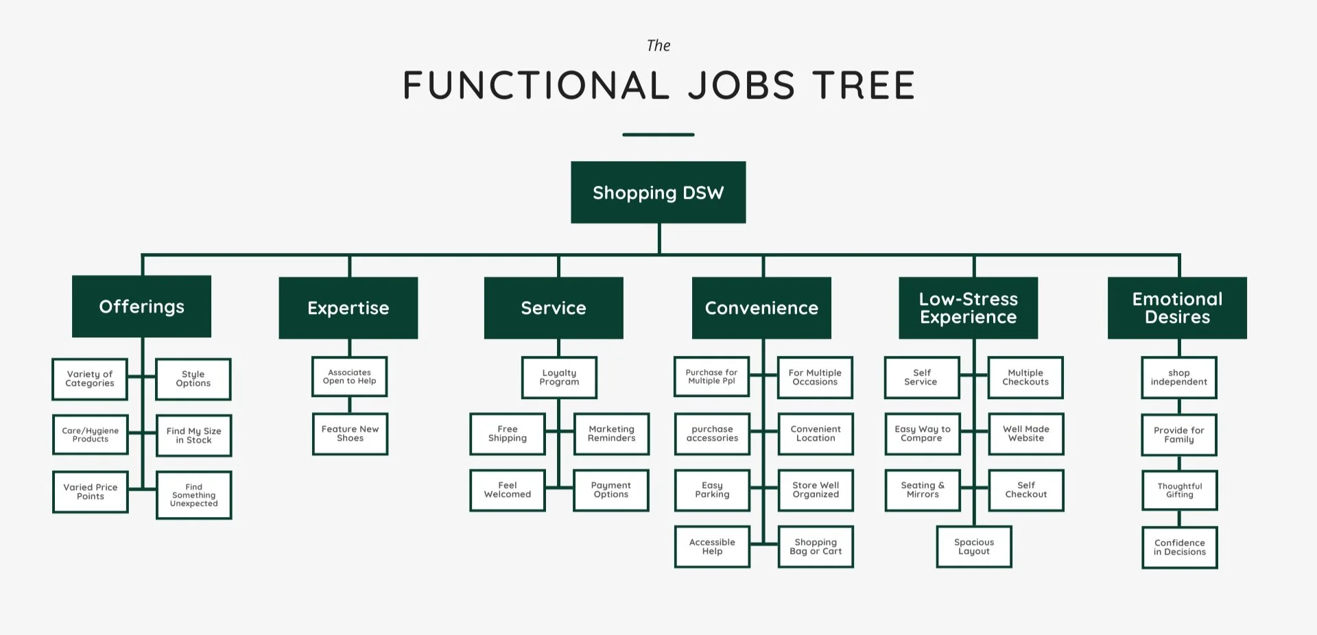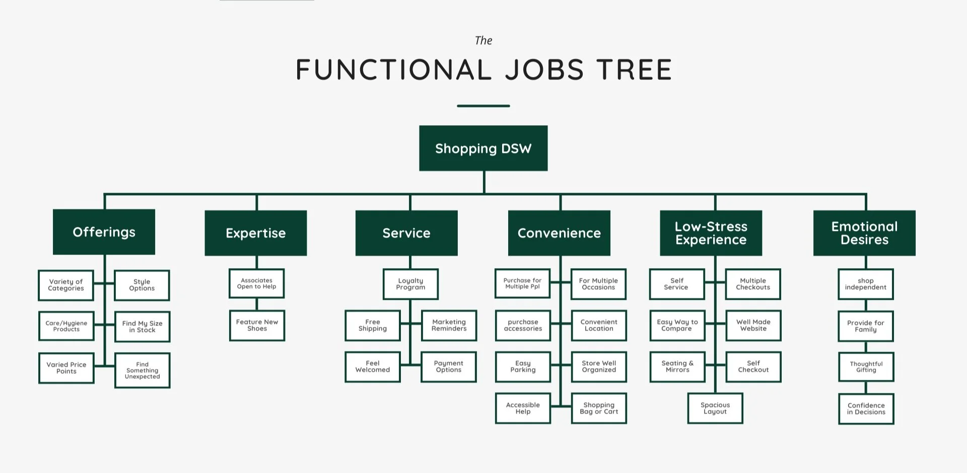 Building on our initial research, we shifted our focus to bridging the gap between online and in-store shopping experiences. To ground our exploration, we selected DSW as our target store, allowing us to study its unique retail environment. Using the Jobs to Be Done framework (Wunker et al.), we identified emotional and functional jobs consumers aim to fulfill, such as the need for the perfect fit, efficiency in their shopping experience, and confidence in their purchases. This approach helped us uncover key opportunities to enhance the shopping journey by addressing unmet needs across digital and physical touchpoints.