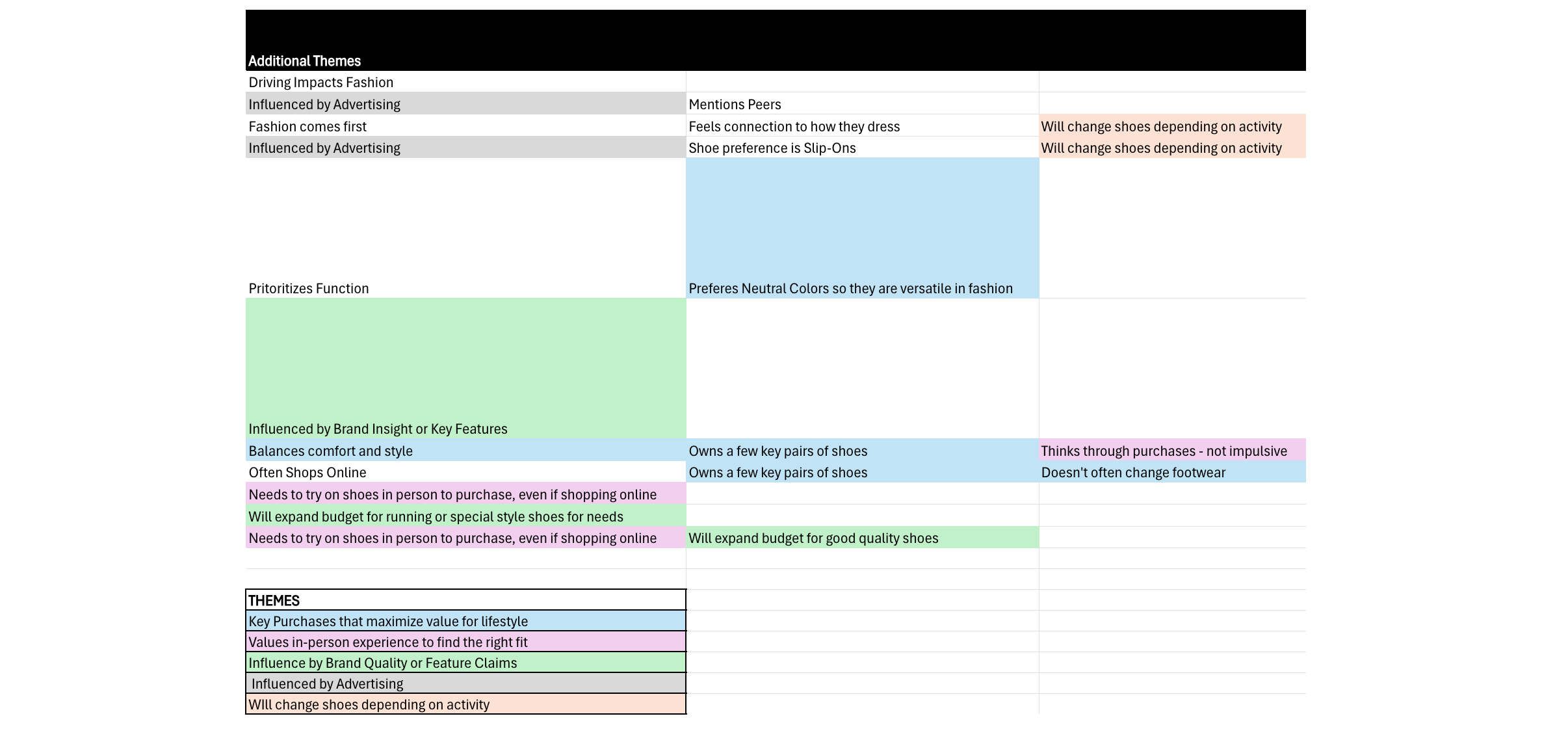 A team member interviewed 11 students at the University of Cincinnati’s School of Design, Architecture, Art, and Planning to gain deeper insights into footwear shopping behaviors. These discussions revealed additional support for the survey findings. 73% of interviewees wanted to shop for shoes in person. A key theme emerged in the interview synthesis and coding process: individuals valued in-person shopping experiences in finding the right shoe fit.