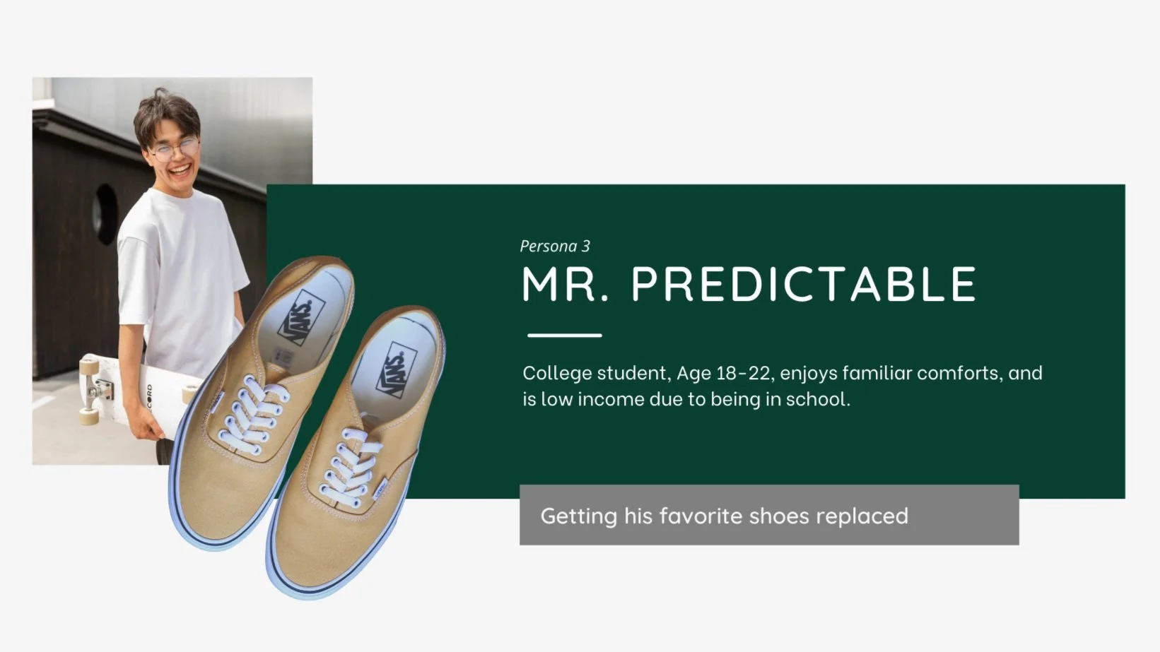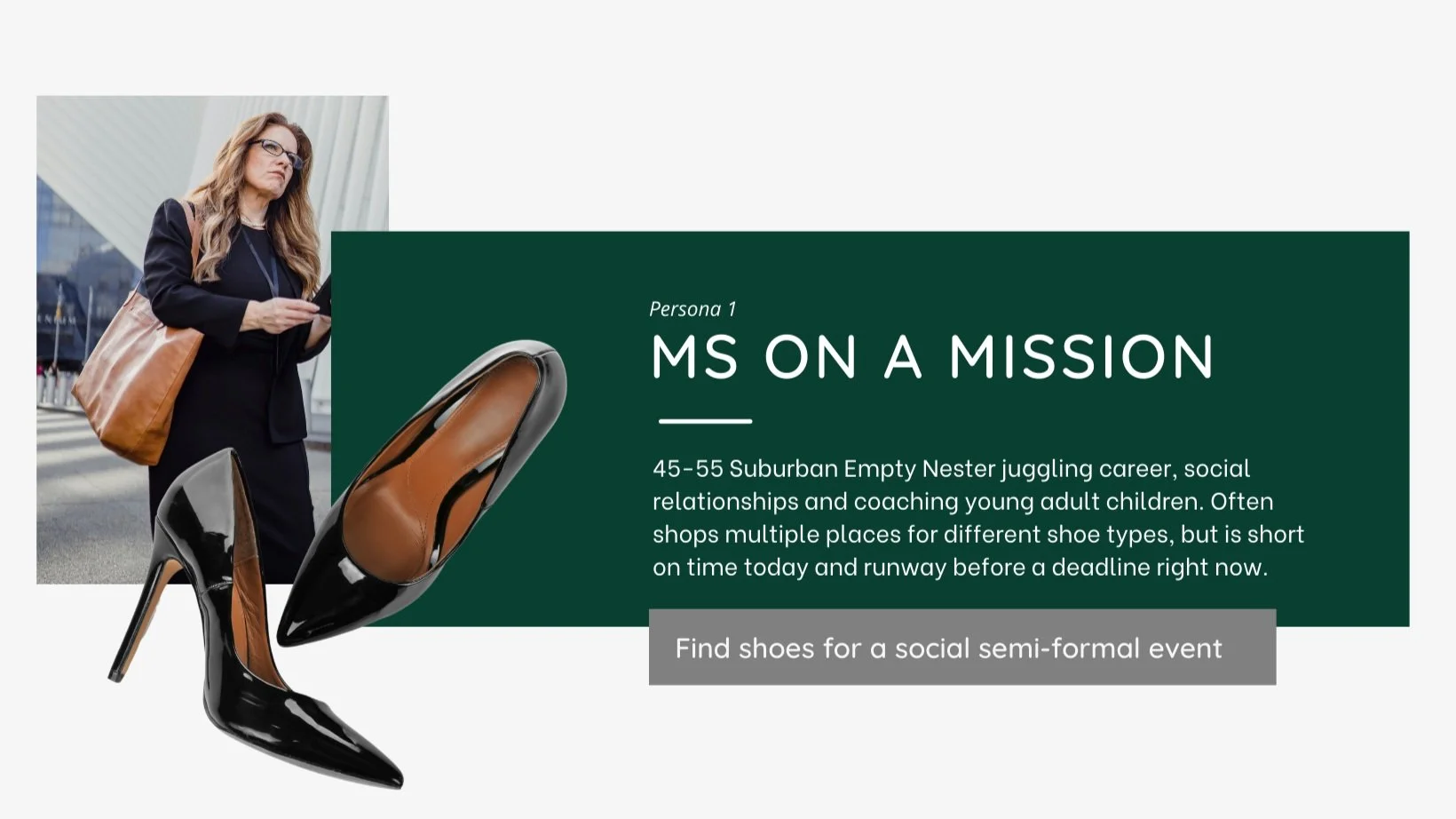 We developed three key personas grounded in insights from our research and the Jobs to Be Done framework to deepen our understanding of user needs. These personas include Ms. On a Mission, shopping with a purpose for specific occasions; the Busy Family, focused on efficient back-to-school shopping; and Mr. Predictable, seeking to replace well-loved, reliable shoes. Each persona reflects distinct emotional and functional jobs, providing perspectives to guide our design process and ensure solutions address the needs of our target audiences.